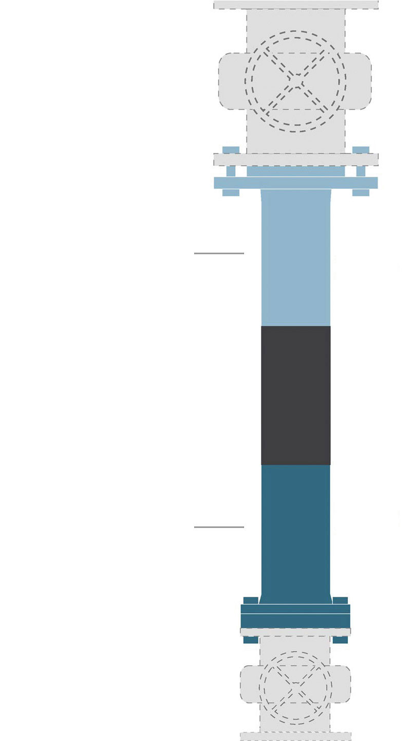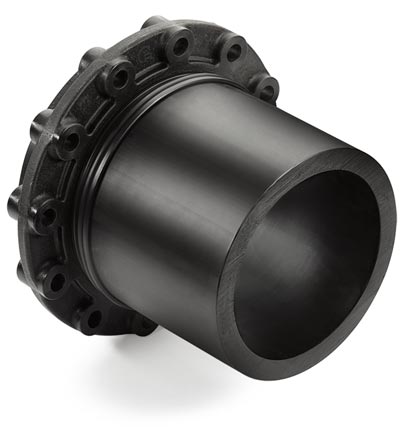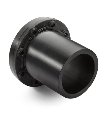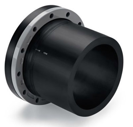 Due to differing pipe wall thicknesses but identical flange connection dimensions, marked cross-section variations occur in PE/PP and steel/cast fittings, especially from DN/OD 355 mm. A special flange connection equalises the resulting offset. Depositions and flow problems are minimised. A connection results that is in accordance with nominal widths. In addition, narrow flaps can be used without these hitting the PE stub end. This enables at the same time to reduce project costs.